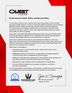 It is policy of Quest Liner, a liquid and dry bulk transportation service provider operating in North America, to meet or exceed the highest standards of environmental protection, health, safety, security, and customer service in all of its operations.