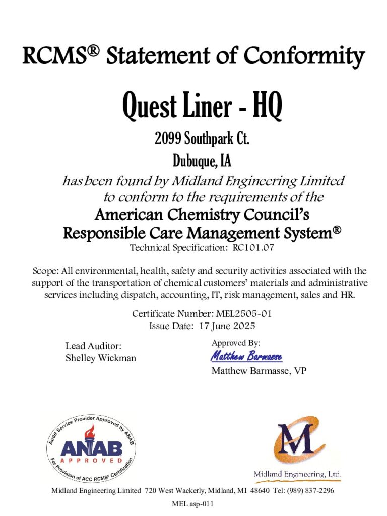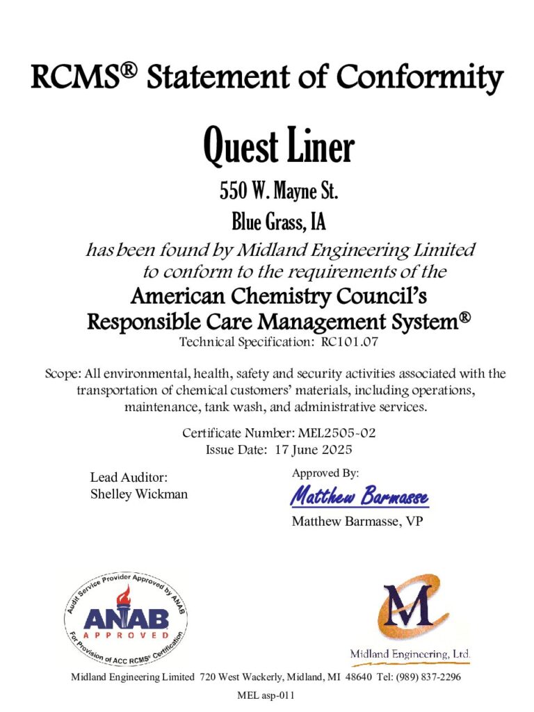 Quest Liner and all of its locations have been found by Midland Engineering Limited to conform to the requirements of the American Chemistry Council’s Responsible Care Management System.